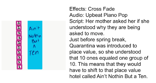 Just before spring break, Quarantina was introduced to place value, so she understood that 10 ones equaled one group of 10. This means that they would have to shift to that place value hotel called Ain’t Nothin But a Ten.