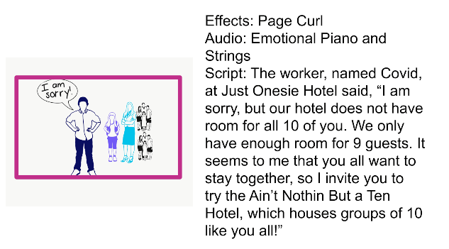 The worker, named Covid, at Just Onesie Hotel said, “I am sorry, but our hotel does not have room for all 10 of you. We only have enough room for 9 guests. It seems to me that you all want to stay together, so I invite you to try the Ain’t Nothin But a Ten Hotel, which houses groups of 10 like you all!”
